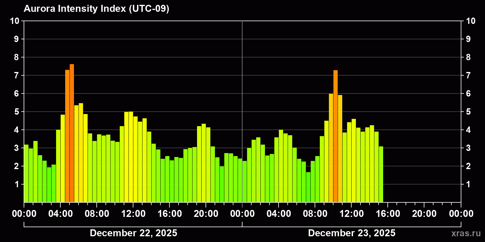 Auroral intensity index and the theoretically possible latitude of observations for nighttime in the Western Hemisphere as of 2025-12-23 13:05 (end of day) local time