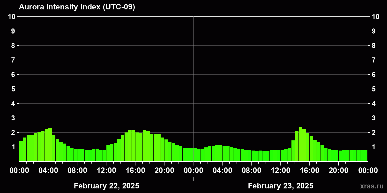 Changes in the auroral intensity index from 2025-02-22 to 2025-02-23 local time