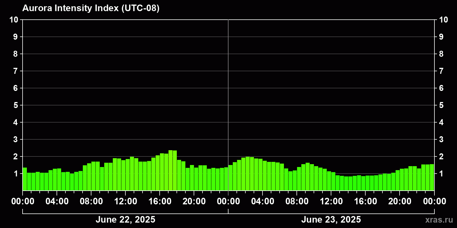 Auroral intensity index and the theoretically possible latitude of observations for nighttime in the Western Hemisphere as of 2025-06-23 23:45 (end of day) local time