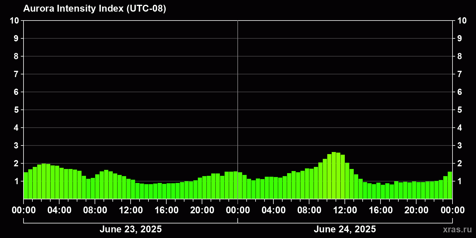 Changes in the auroral intensity index from 2025-06-23 to 2025-06-24 local time