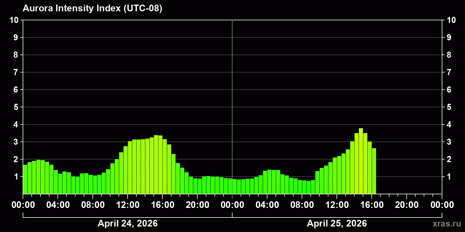 Auroral intensity index and the theoretically possible latitude of observations for nighttime in the Western Hemisphere as of 2026-04-25 14:46 (end of day) local time