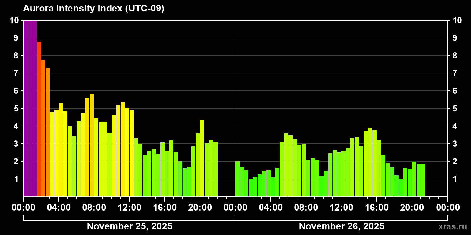 Changes in the auroral intensity index from 2025-11-25 to 2025-11-26 local time