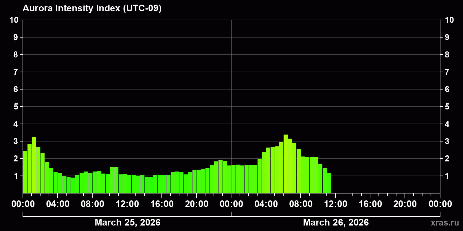 Auroral intensity index and the theoretically possible latitude of observations for nighttime in the Western Hemisphere as of 2026-03-26 09:45 (end of day) local time