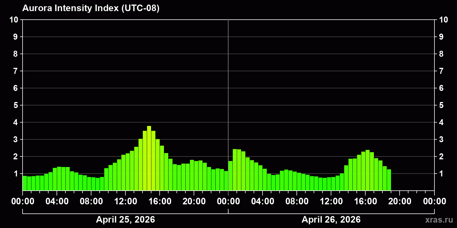 Auroral intensity index and the theoretically possible latitude of observations for nighttime in the Western Hemisphere as of 2026-04-26 13:10 (end of day) local time