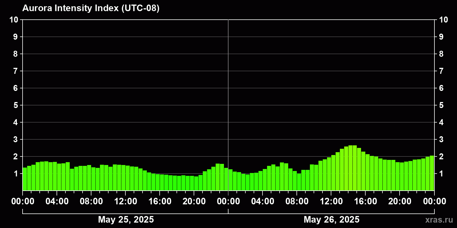 Changes in the auroral intensity index from 2025-05-25 to 2025-05-26 local time