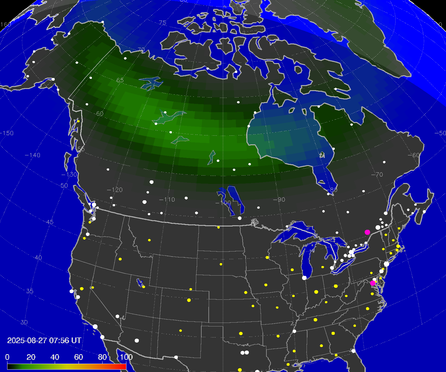 Probability of northern lights (auroras) in cities of United States