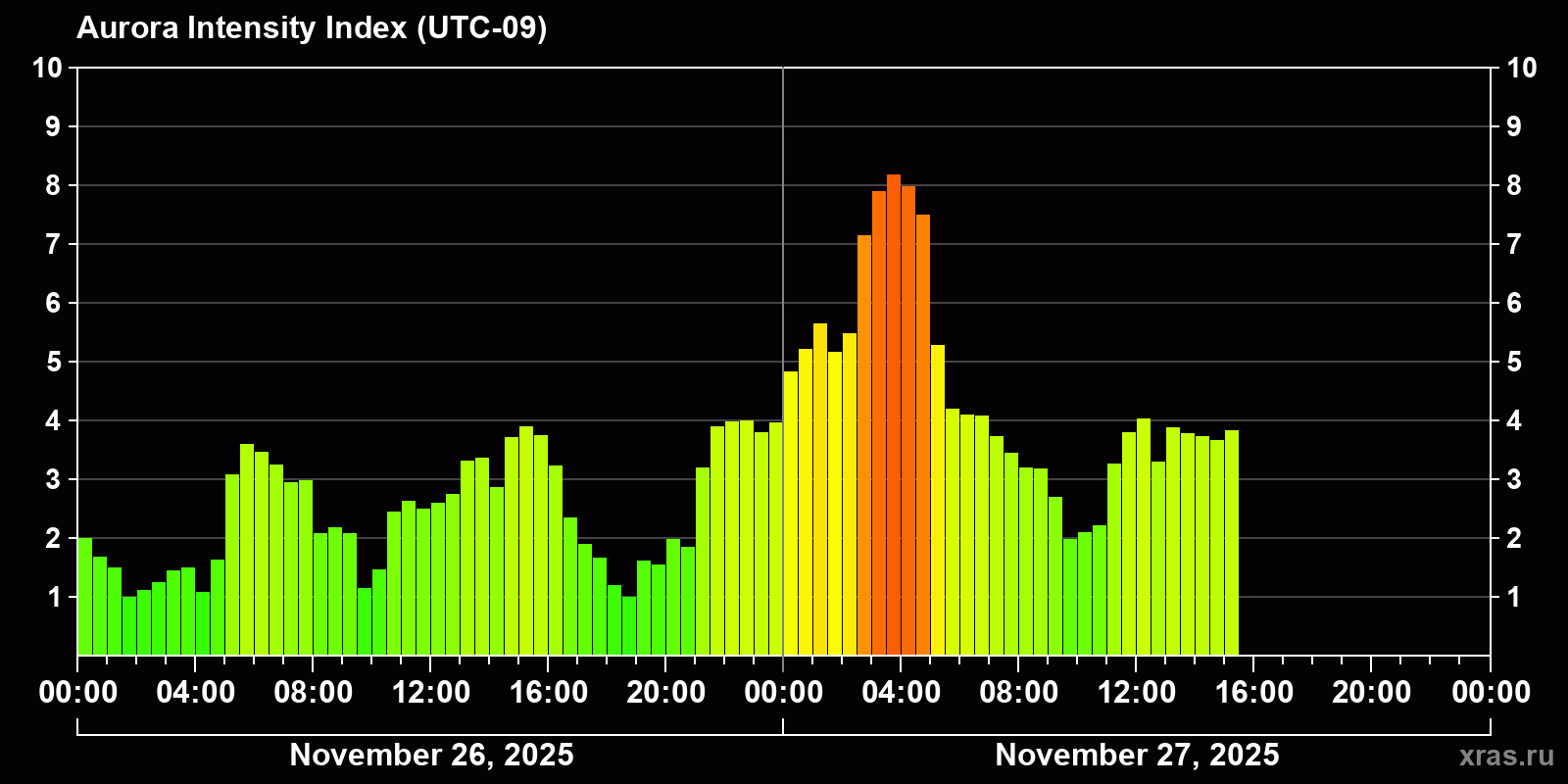 Changes in the auroral intensity index from 2025-11-26 to 2025-11-27 local time
