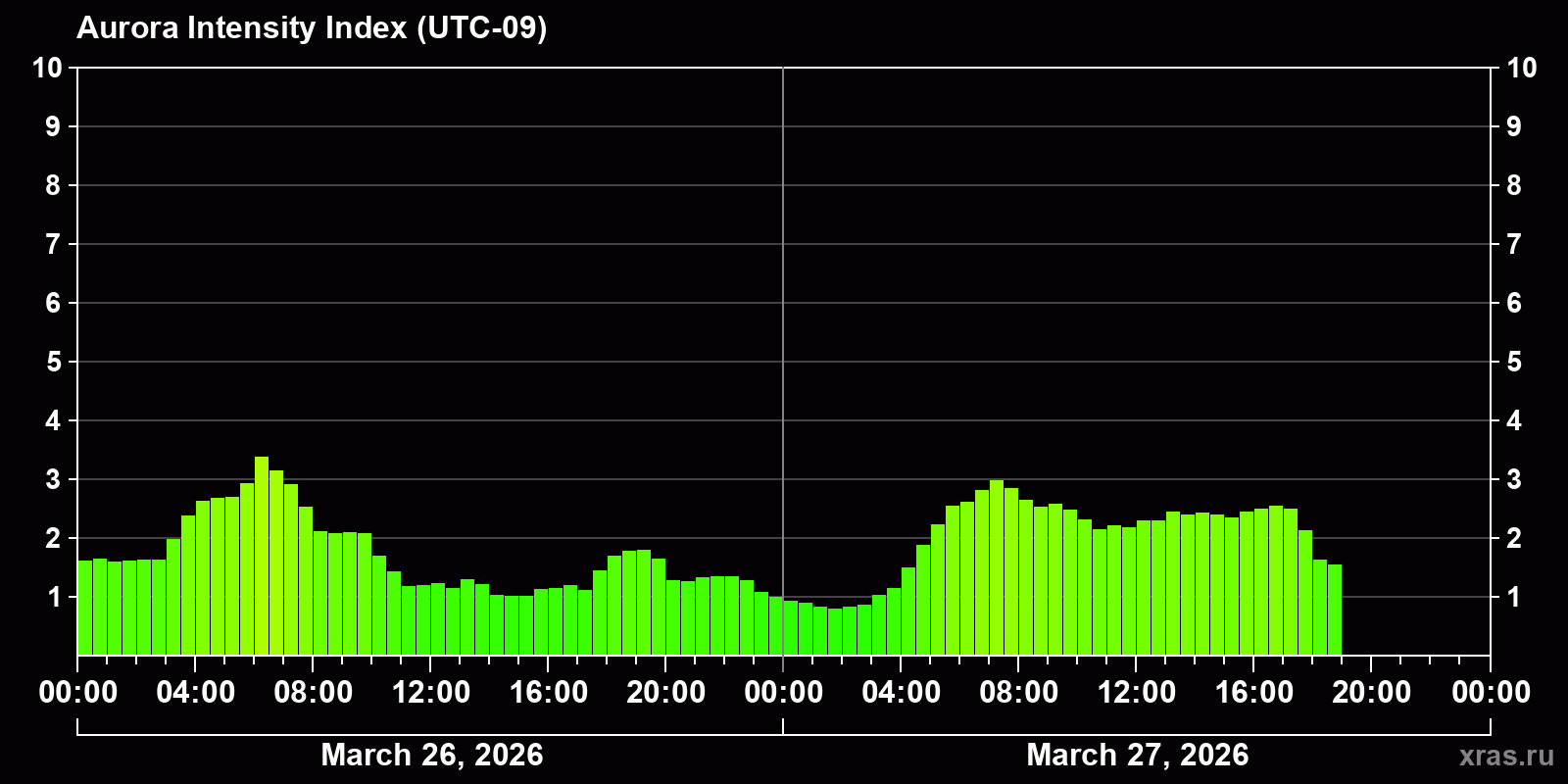 Changes in the auroral intensity index from 2026-03-26 to 2026-03-27 local time