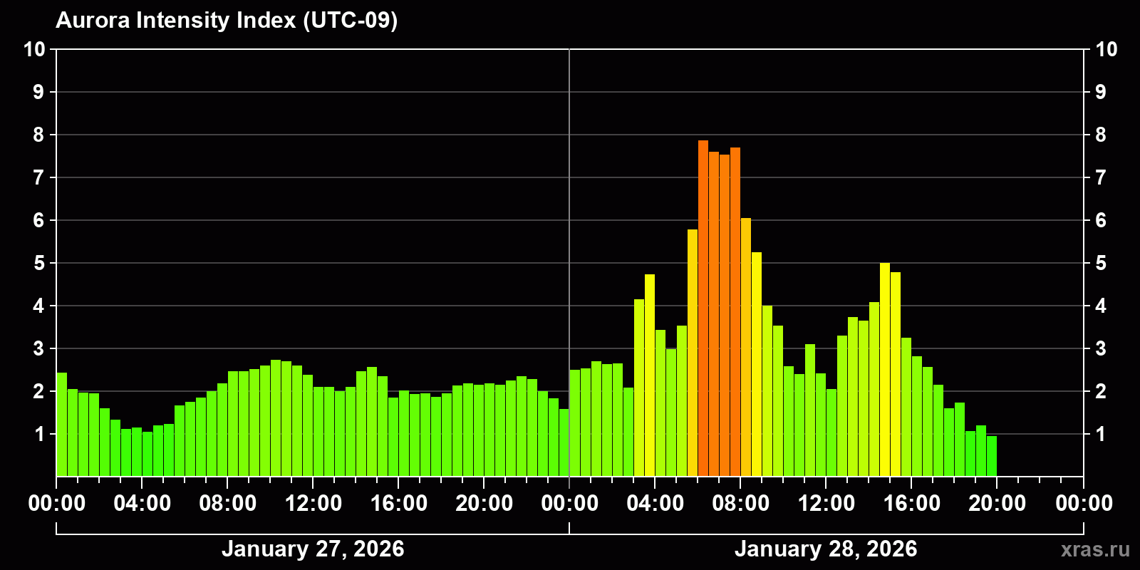 Auroral intensity index and the theoretically possible latitude of observations for nighttime in the Western Hemisphere as of 2026-01-28 18:15 (end of day) local time