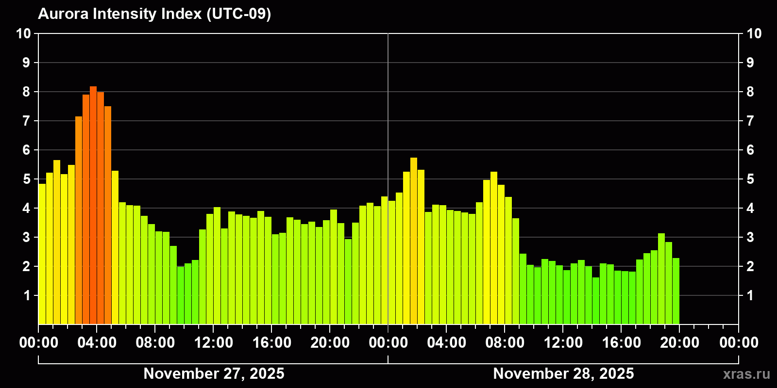 Auroral intensity index and the theoretically possible latitude of observations for nighttime in the Western Hemisphere as of 2025-11-28 18:06 (end of day) local time