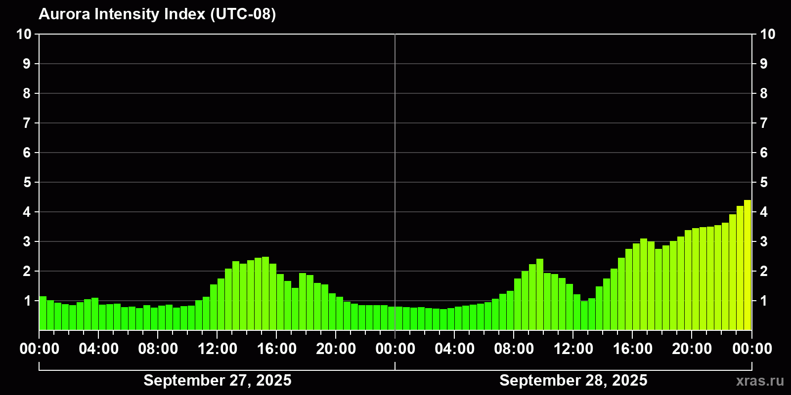 Auroral intensity index and the theoretically possible latitude of observations for nighttime in the Western Hemisphere as of 2025-09-28 23:57 (end of day) local time