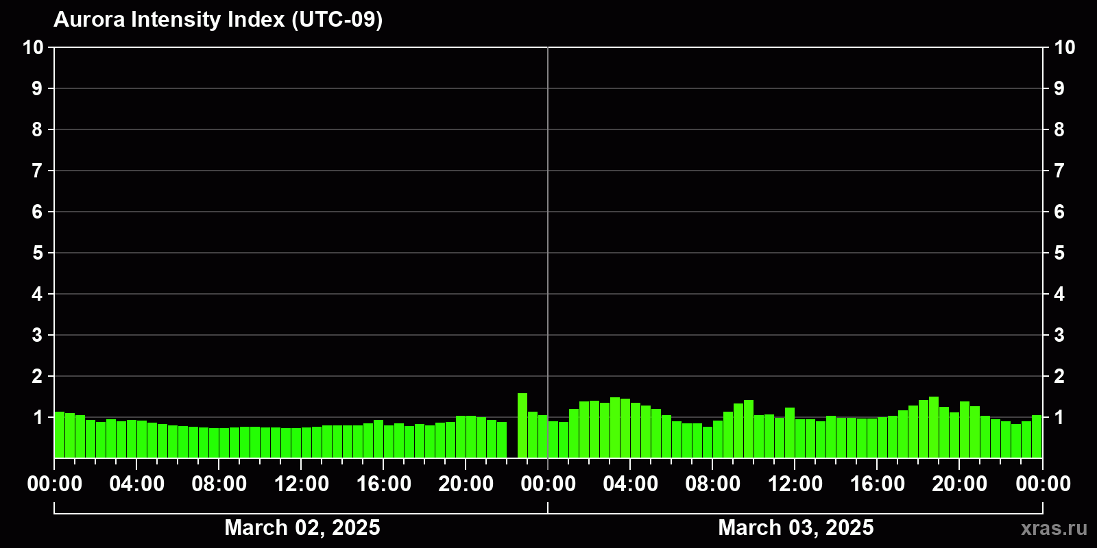 Changes in the auroral intensity index from 2025-03-02 to 2025-03-03 local time