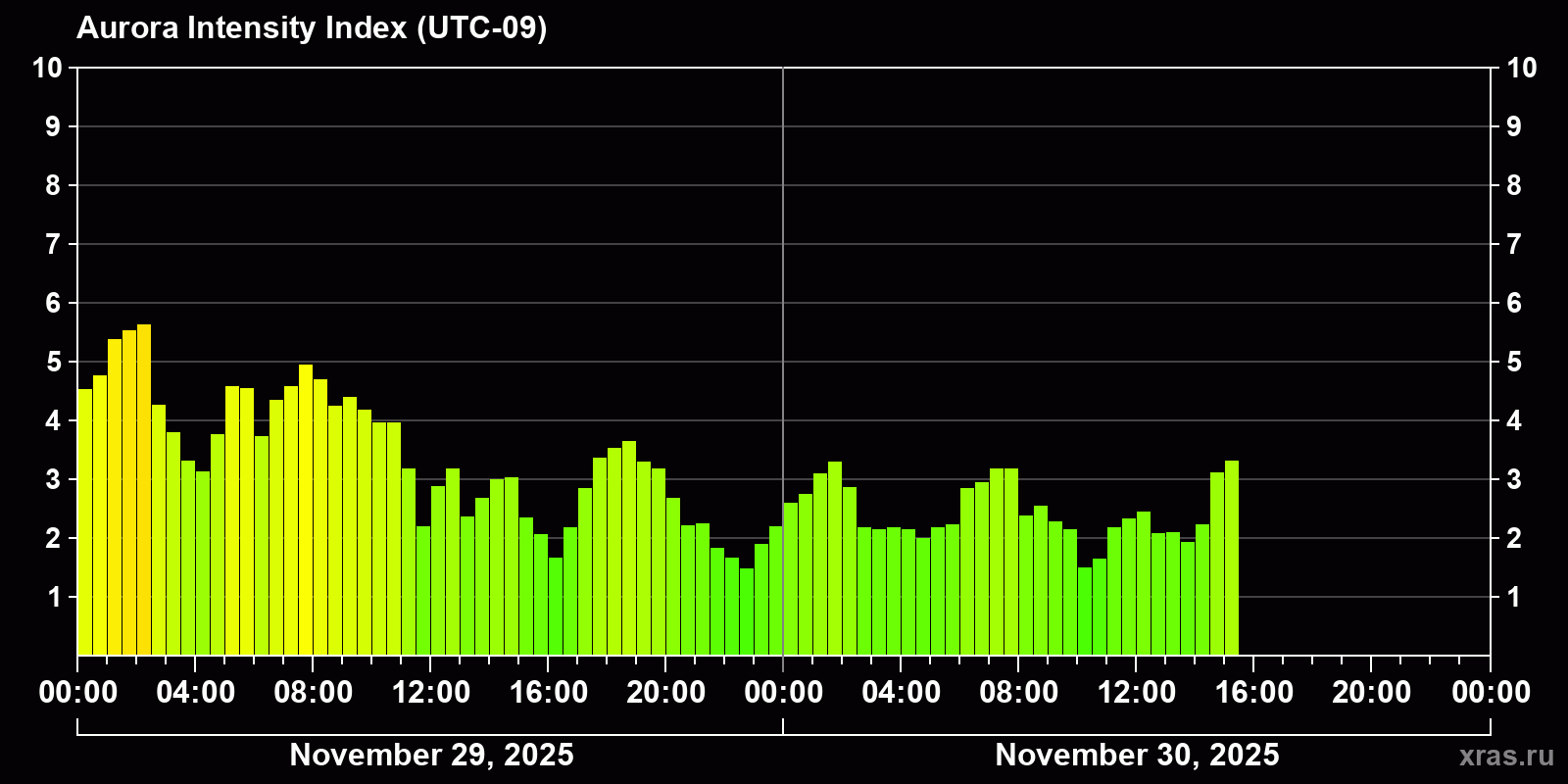 Auroral intensity index and the theoretically possible latitude of observations for nighttime in the Western Hemisphere as of 2025-11-30 14:59 (end of day) local time