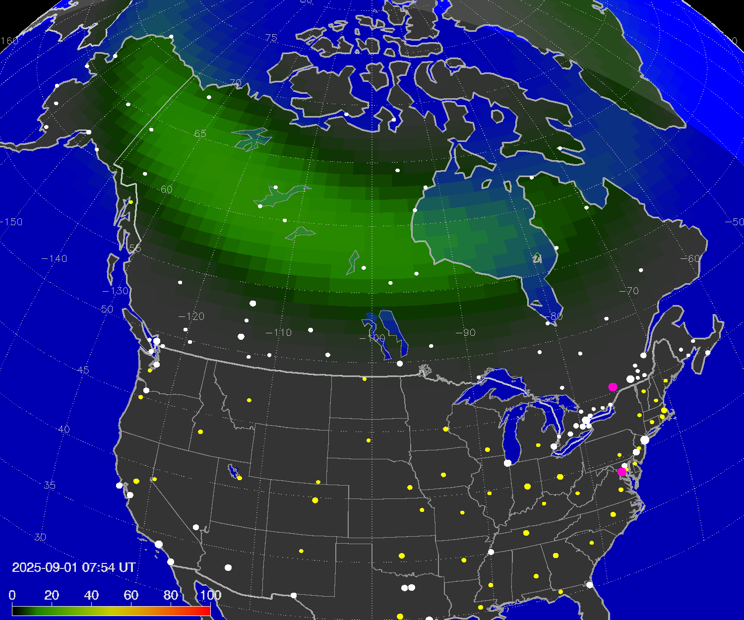 Probability of northern lights (auroras) in cities of United States