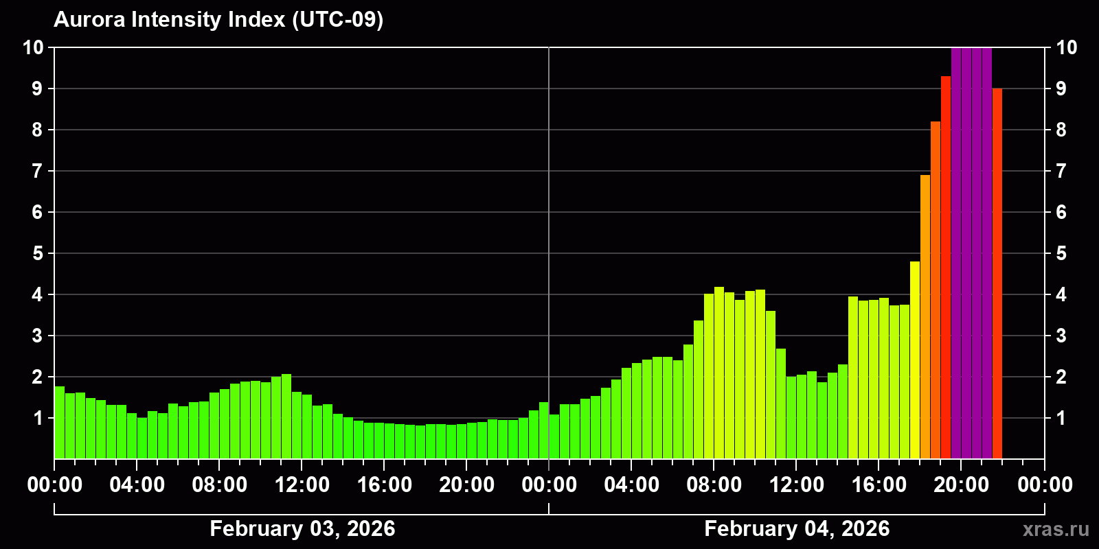 Auroral intensity index and the theoretically possible latitude of observations for nighttime in the Western Hemisphere as of 2026-02-04 19:54 (end of day) local time