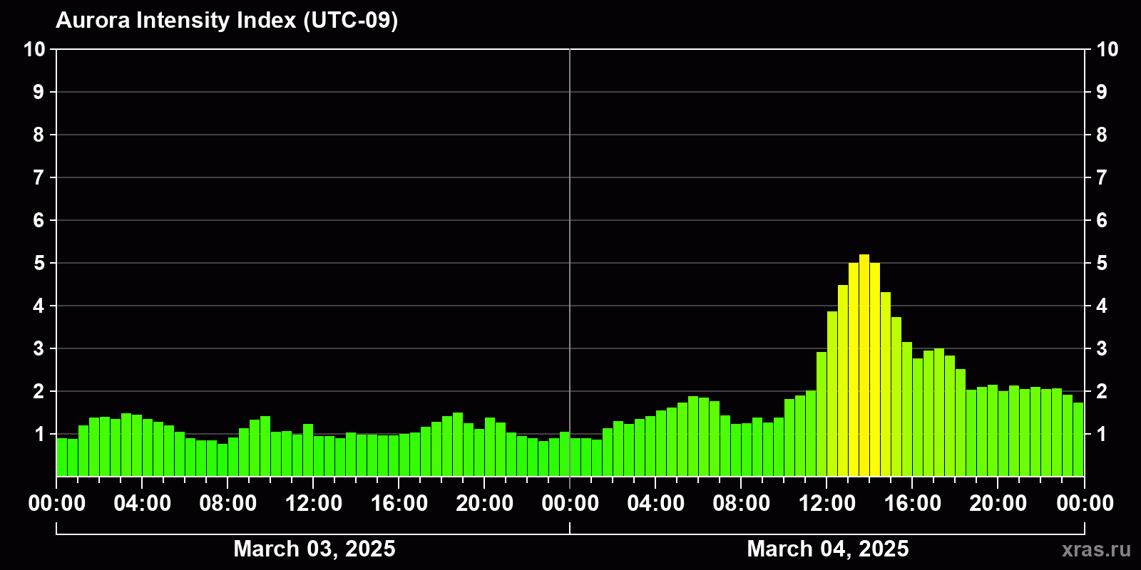 Changes in the auroral intensity index from 2025-03-03 to 2025-03-04 local time