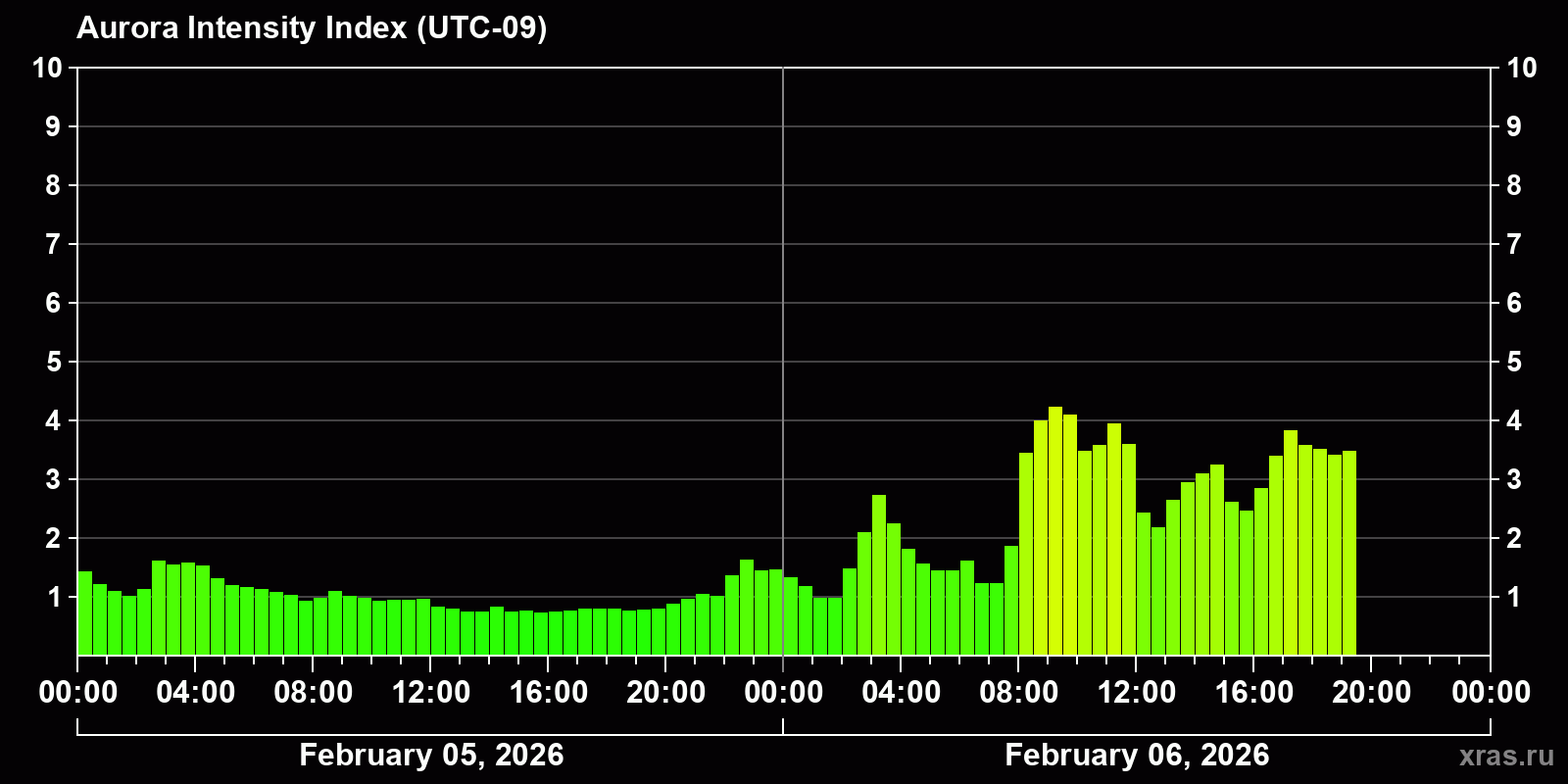 Auroral intensity index and the theoretically possible latitude of observations for nighttime in the Western Hemisphere as of 2026-02-06 17:33 (end of day) local time