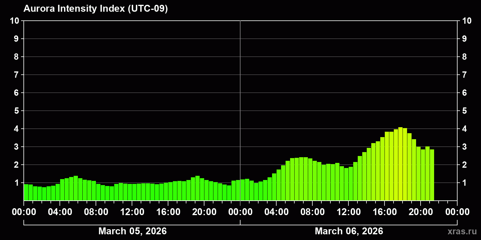 Auroral intensity index and the theoretically possible latitude of observations for nighttime in the Western Hemisphere as of 2026-03-06 19:23 (end of day) local time
