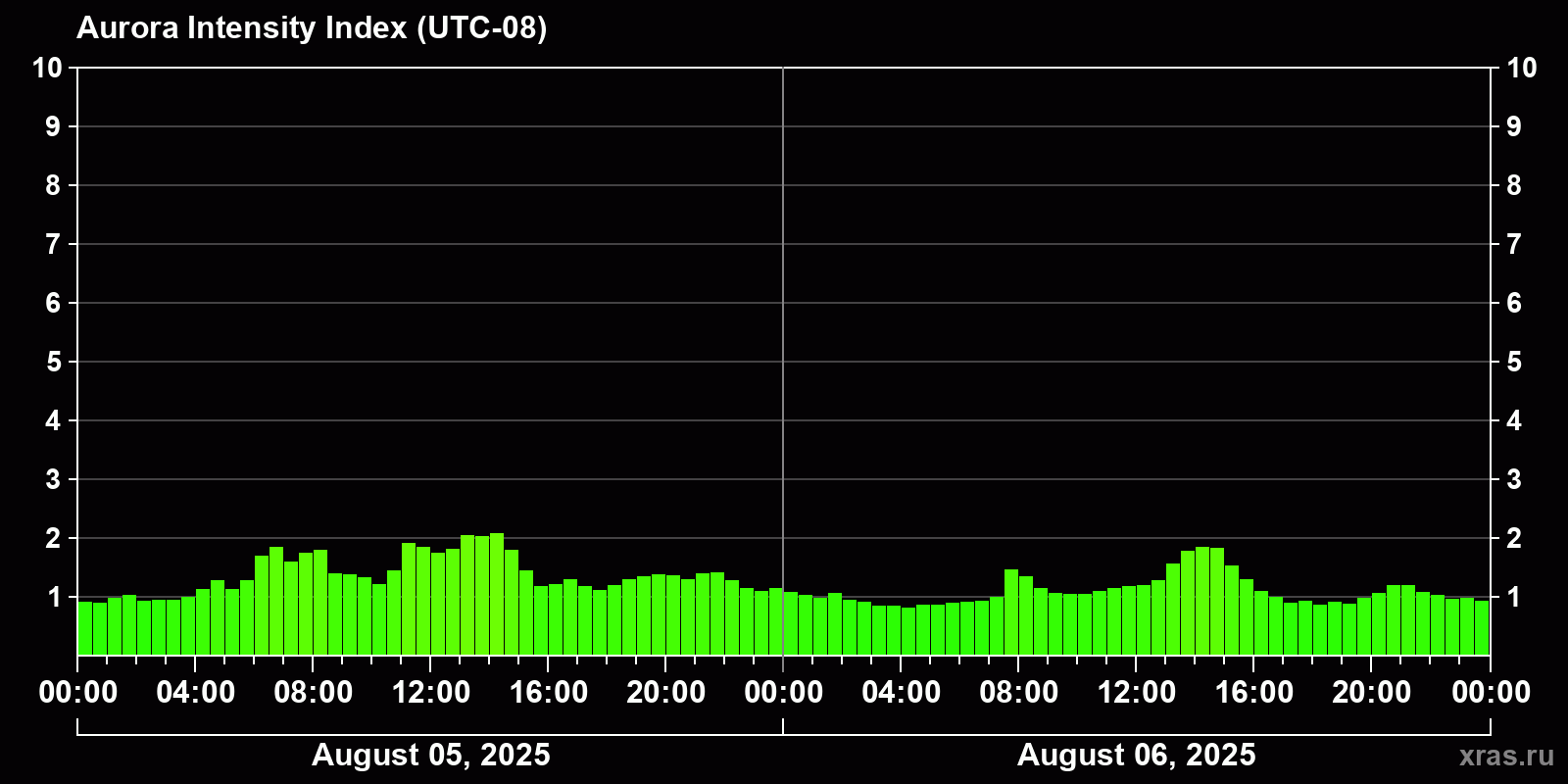 Changes in the auroral intensity index from 2025-08-05 to 2025-08-06 local time