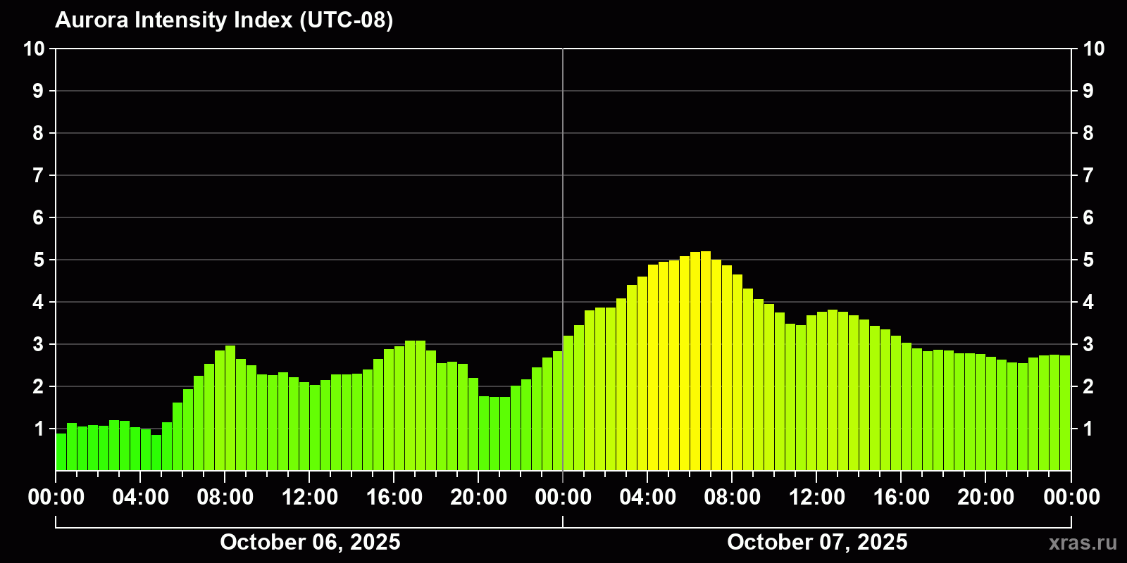 Auroral intensity index and the theoretically possible latitude of observations for nighttime in the Western Hemisphere as of 2025-10-07 23:58 (end of day) local time