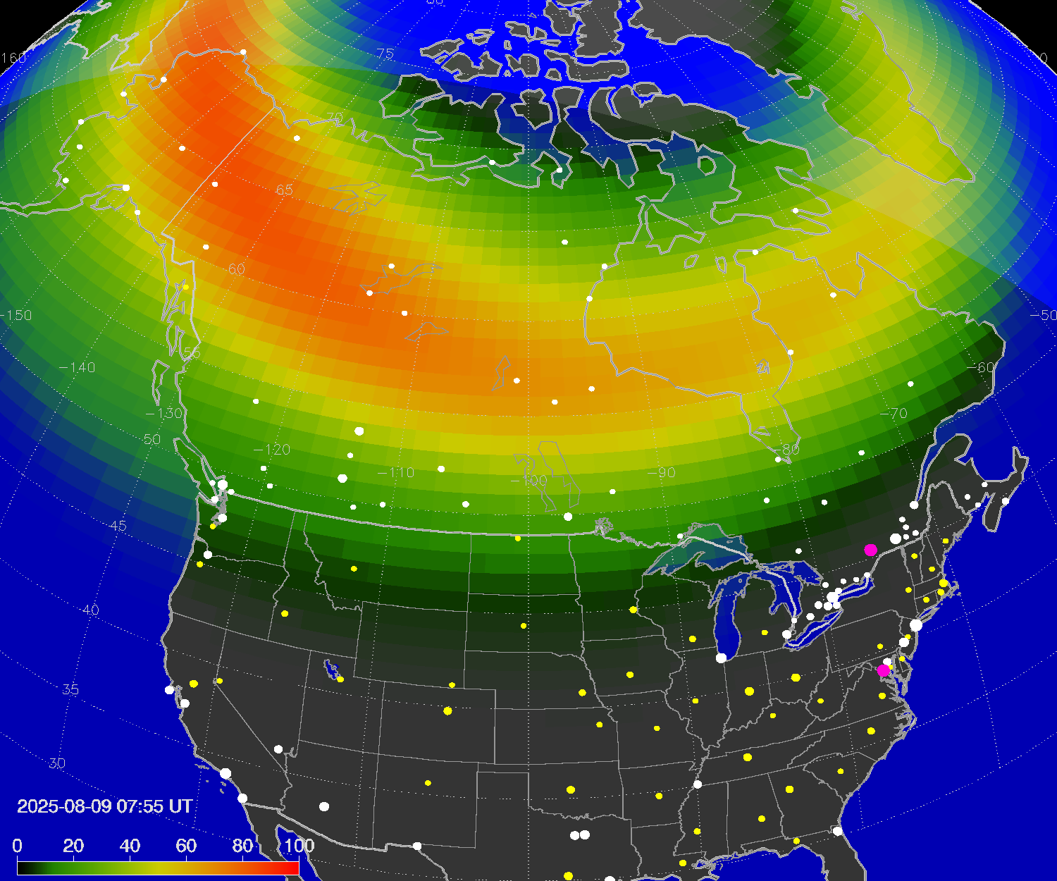 Probability of northern lights (auroras) in cities of United States