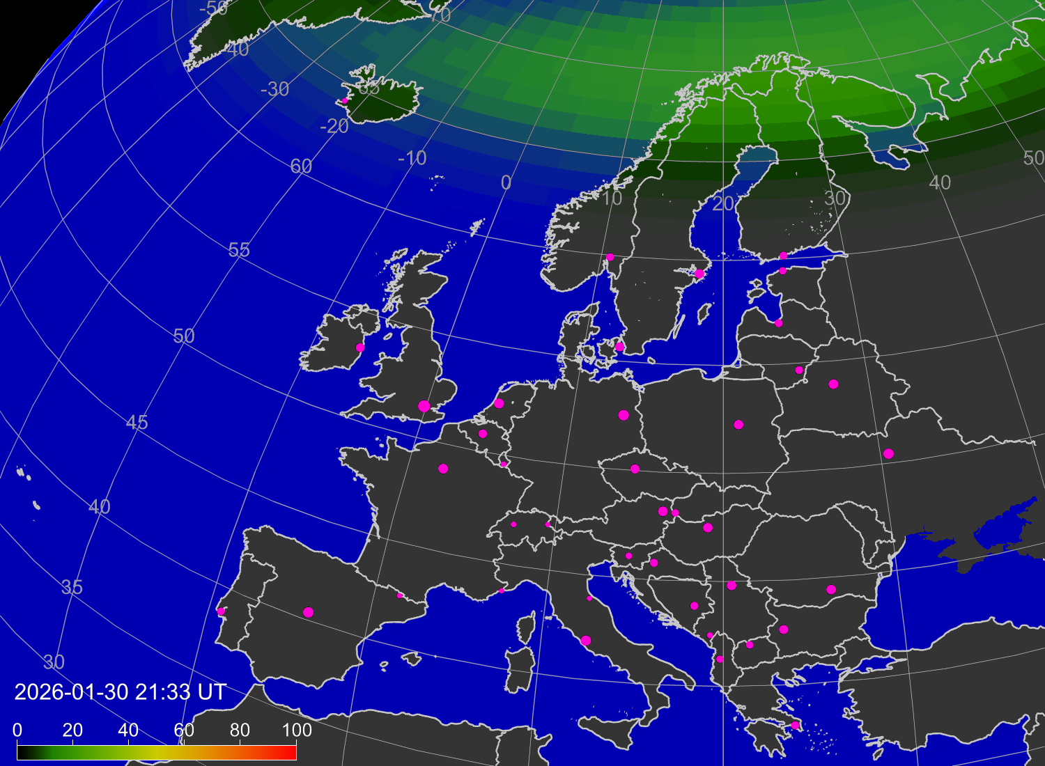 Индекс интенсивности полярных сияний и теоретически возможная широта наблюдений для ночного времени в восточном полушарии