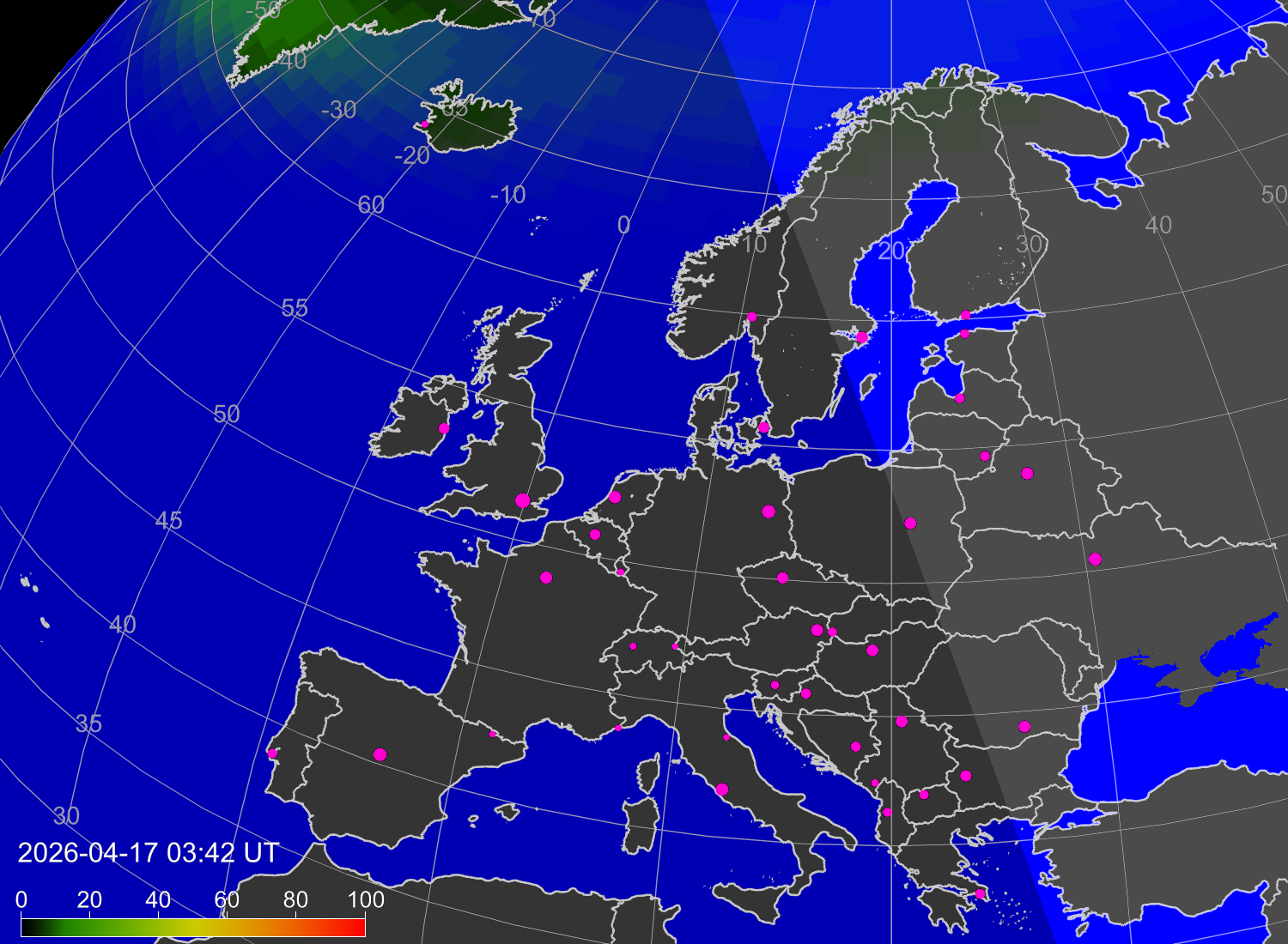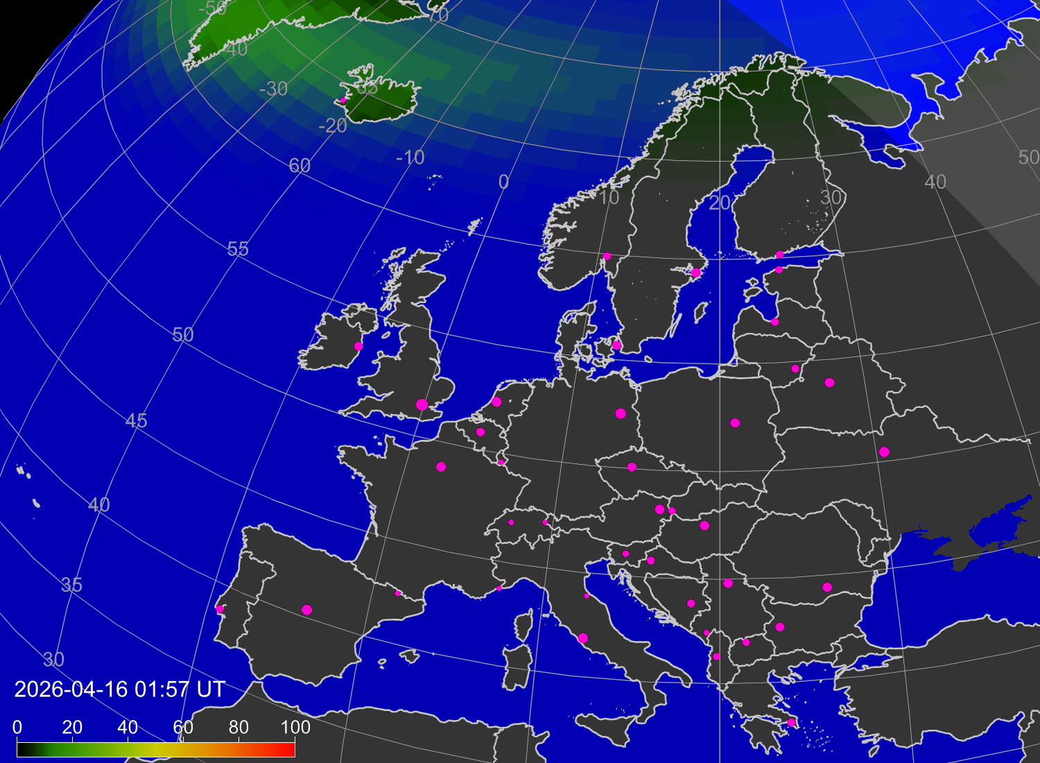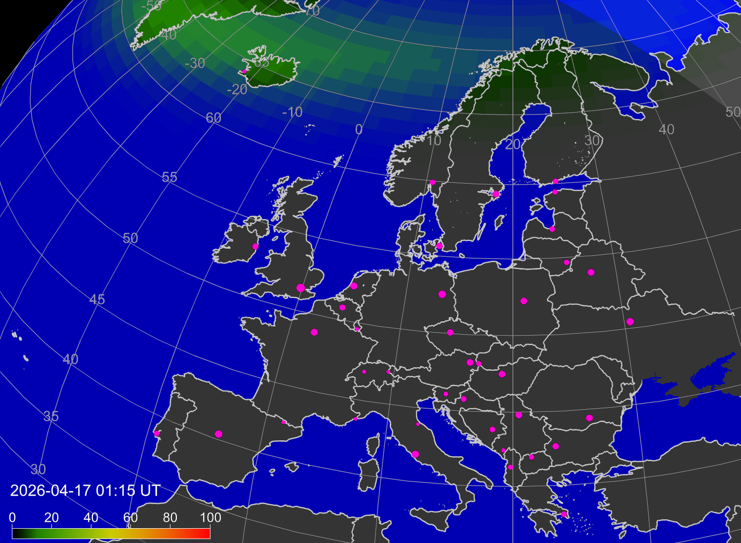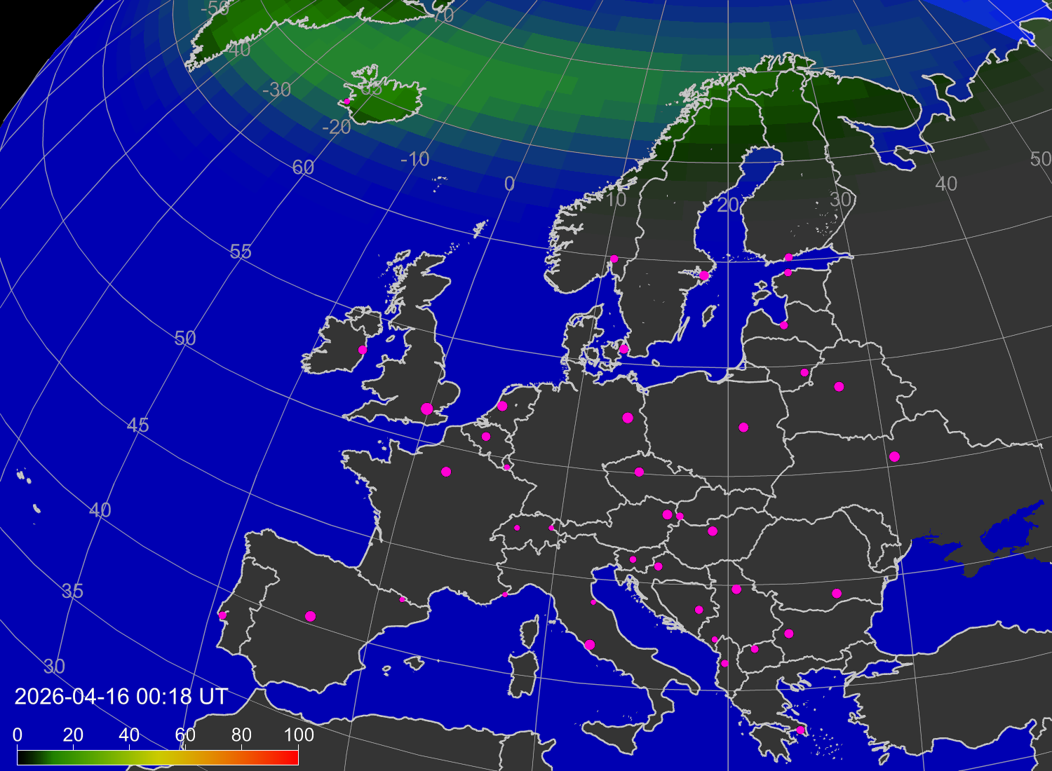 Probability of northern lights (auroras) in cities of Europe