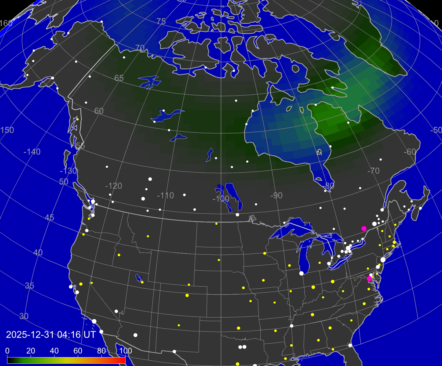 Зона полярных (северных) сияний над территорией Северной Америки