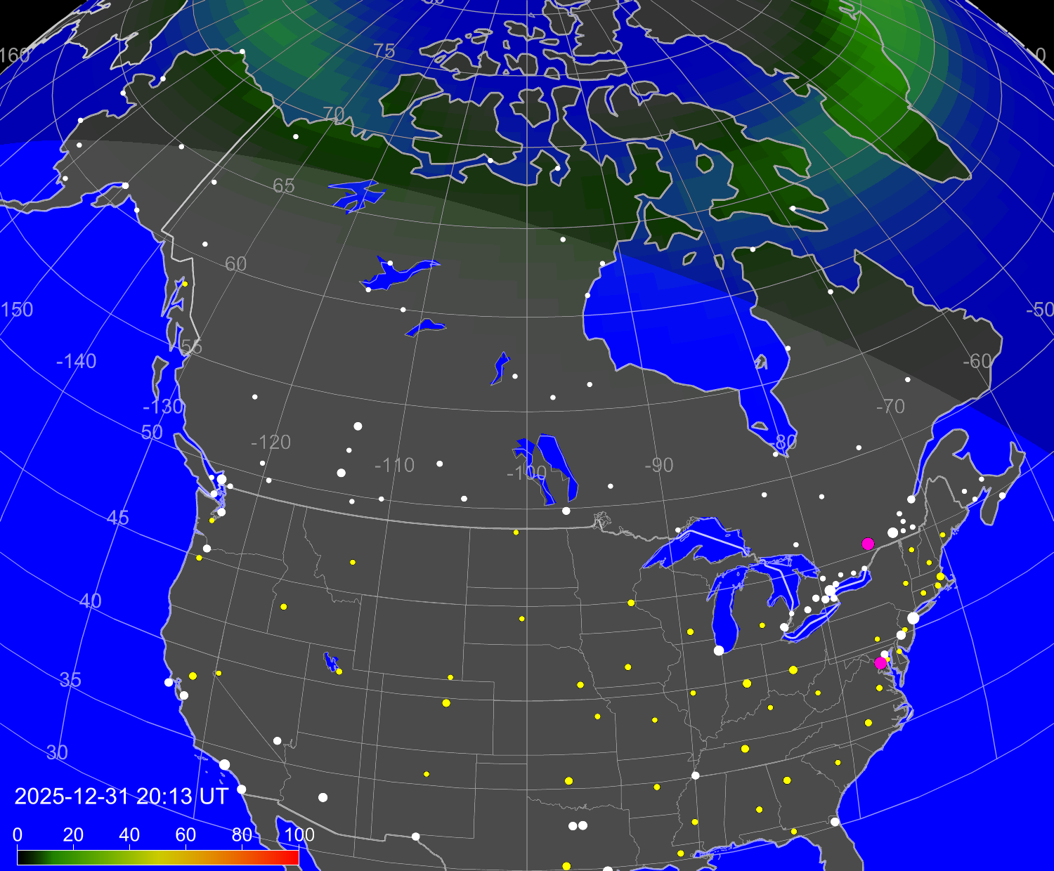 Вероятность полярных сияний в городах США