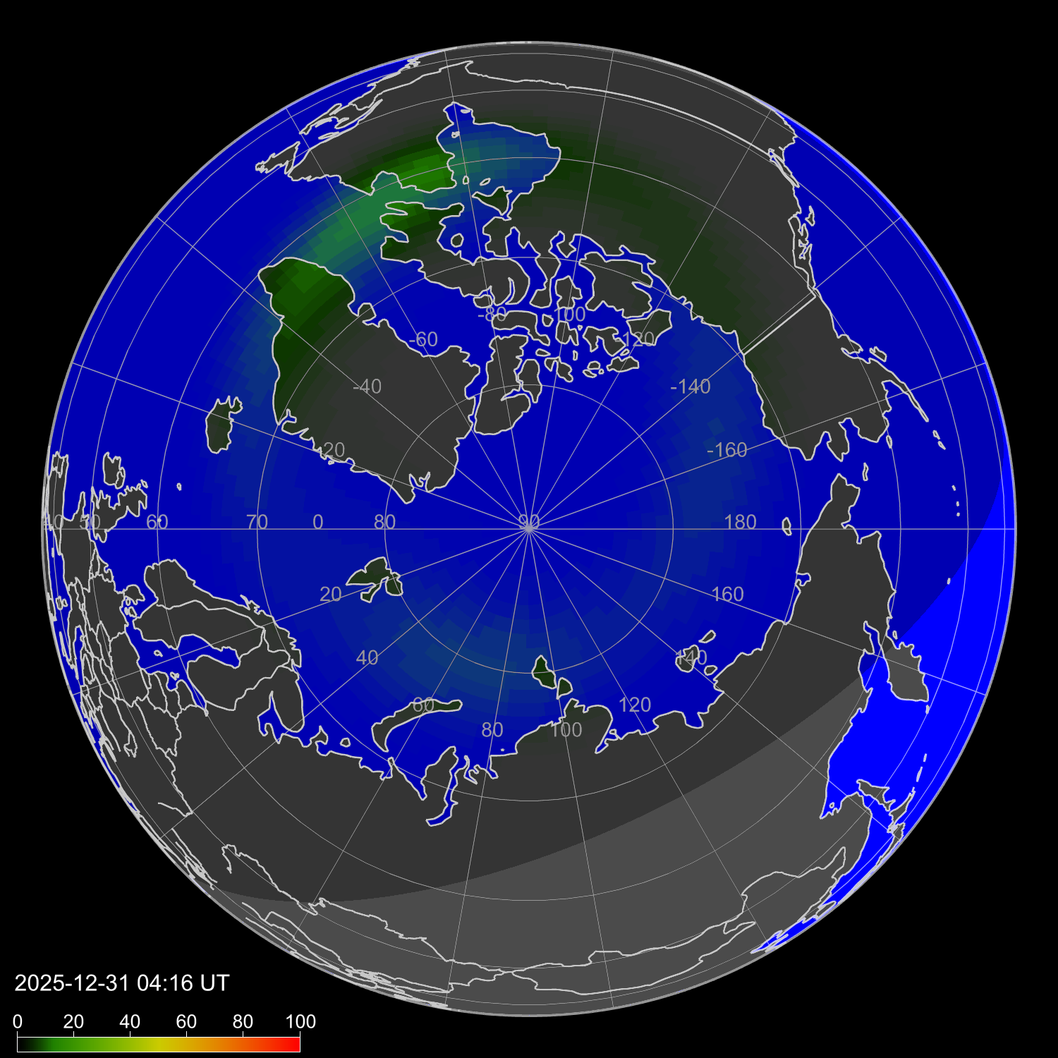 Индекс интенсивности полярных сияний и теоретически возможная широта наблюдений для ночного времени в западном полушарии