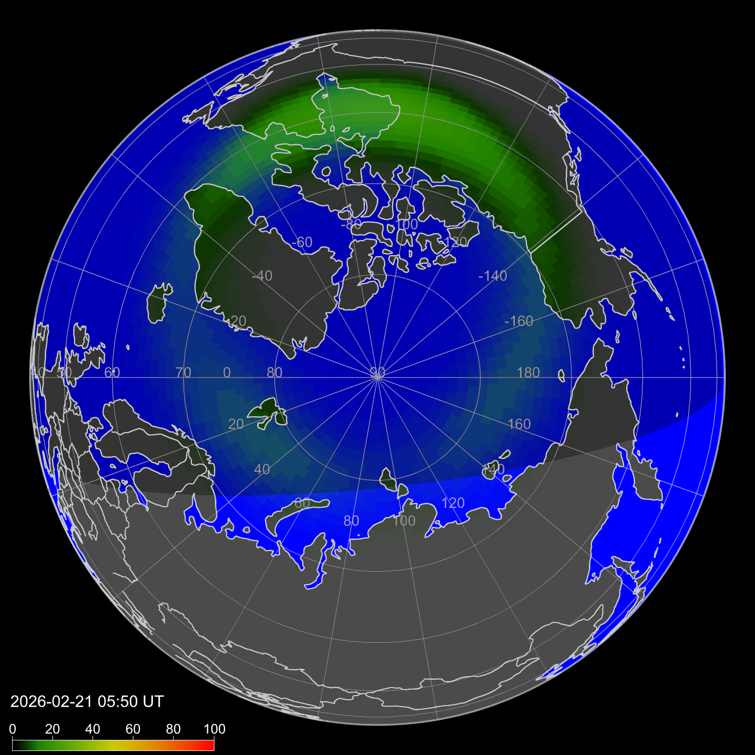 Изменения и часовой прогноз индекса интенсивности полярных сияний с 2026-02-19 по 2026-02-20