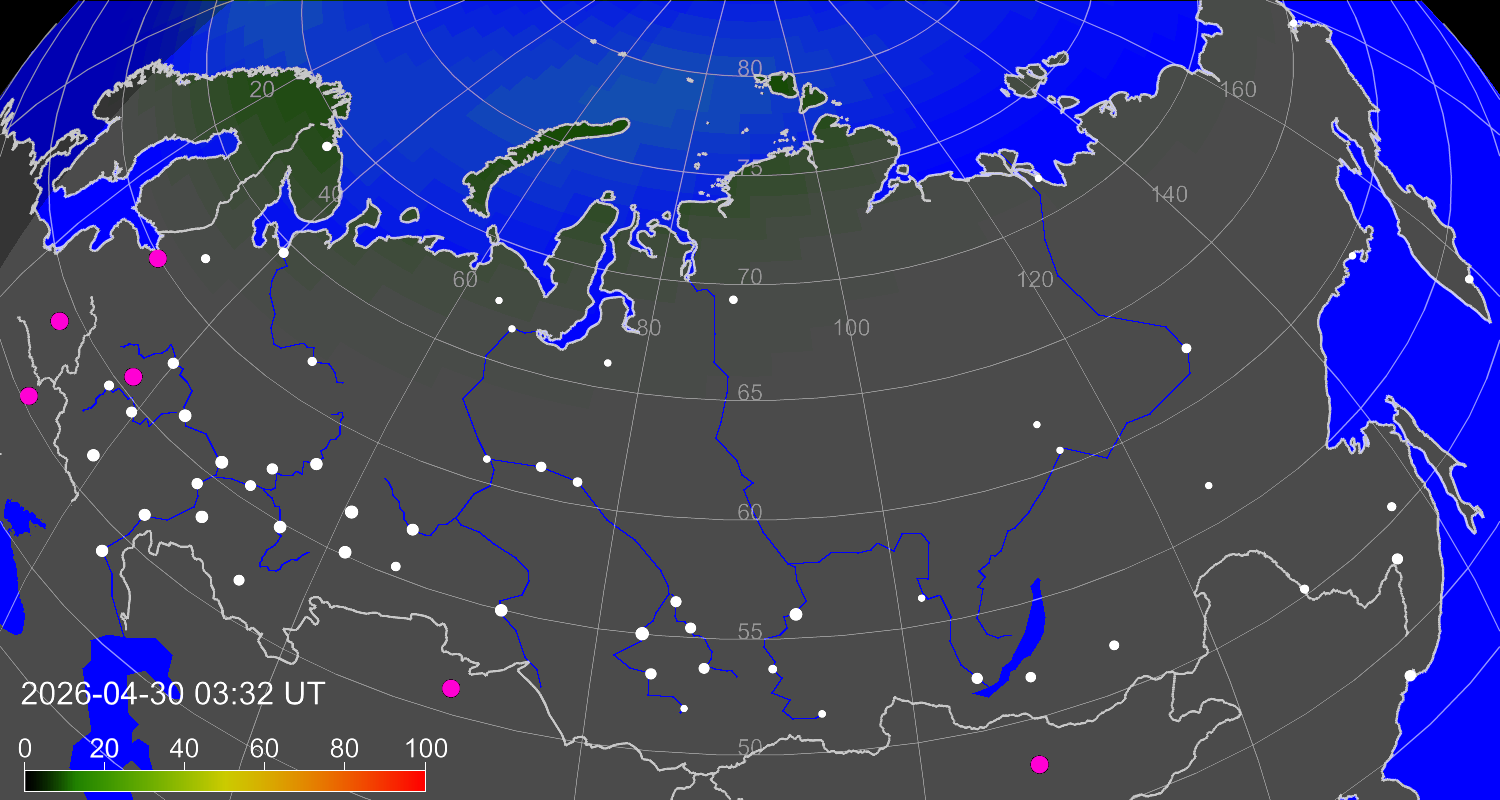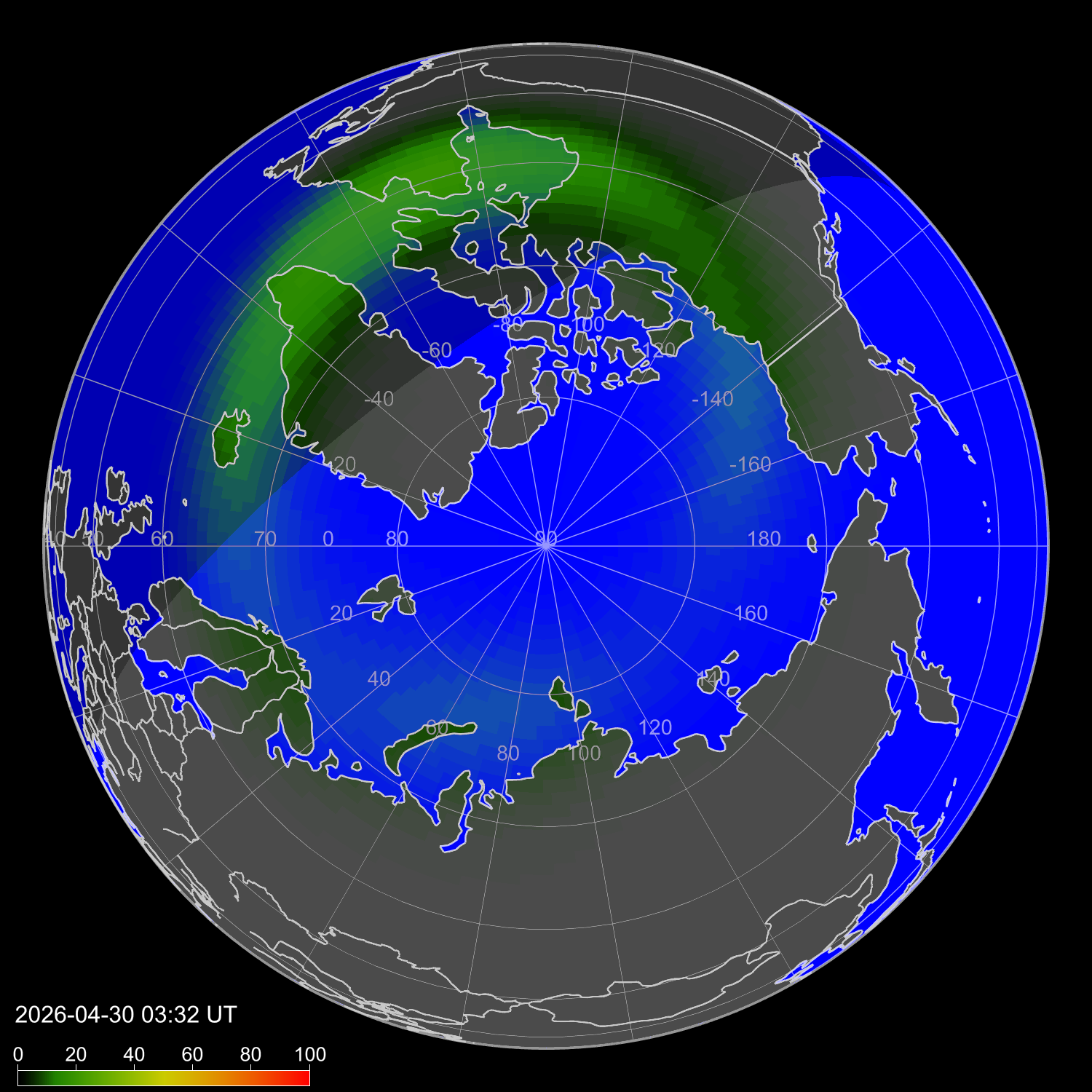 Changes and hourly forecast of the auroral intensity index from 2026-04-29 to 2026-04-30
