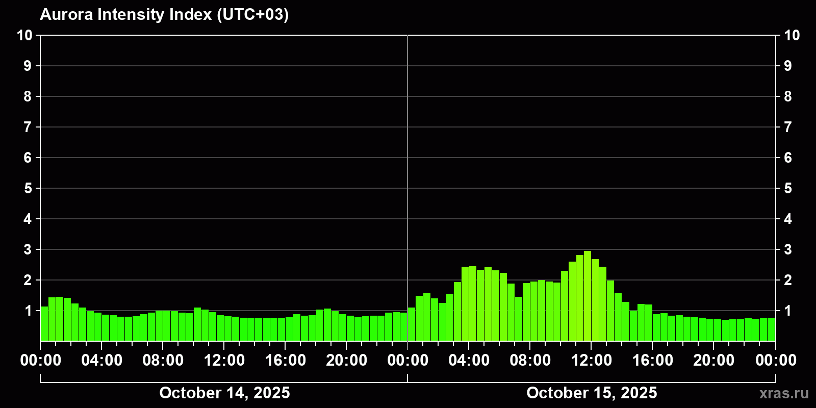 Auroral intensity index and the theoretically possible latitude of observations for nighttime in the Estern Hemisphere as of 2025-10-15 23:50 (end of day) local time