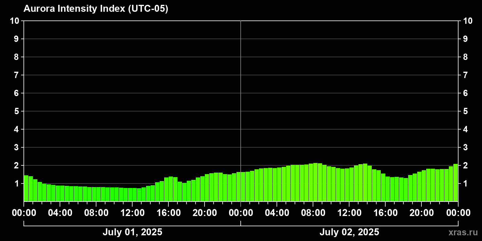 Changes in the auroral intensity index from 2025-07-01 to 2025-07-02 local time