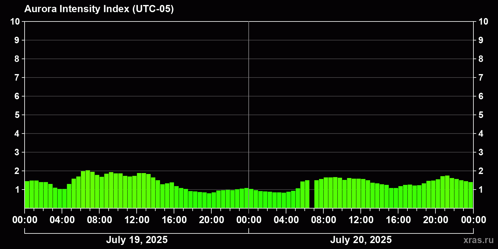 Auroral intensity index and the theoretically possible latitude of observations for nighttime in the Western Hemisphere as of 2025-07-20 23:45 (end of day) local time