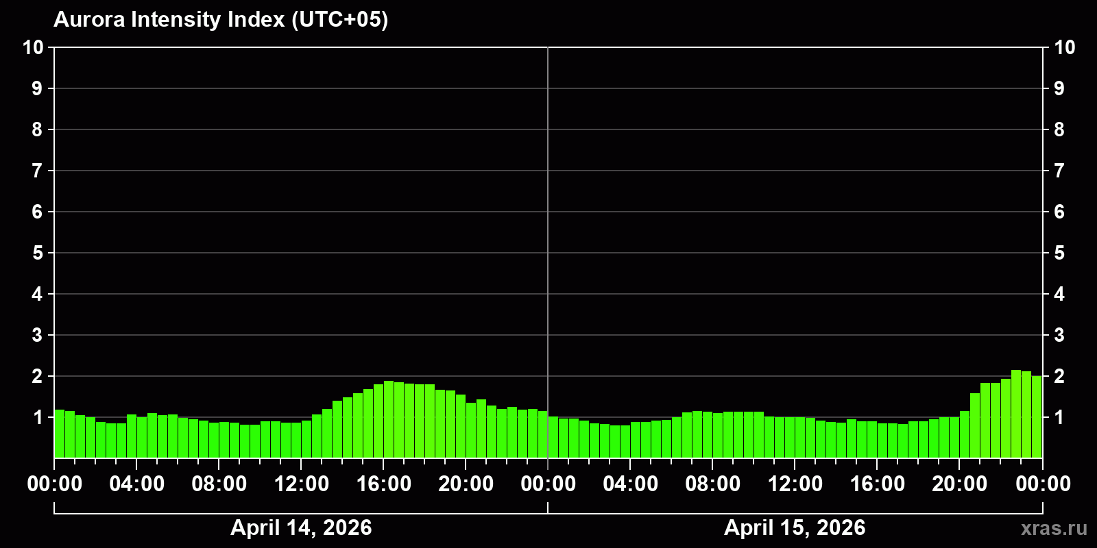 Changes in the auroral intensity index from 2026-04-14 to 2026-04-15 local time