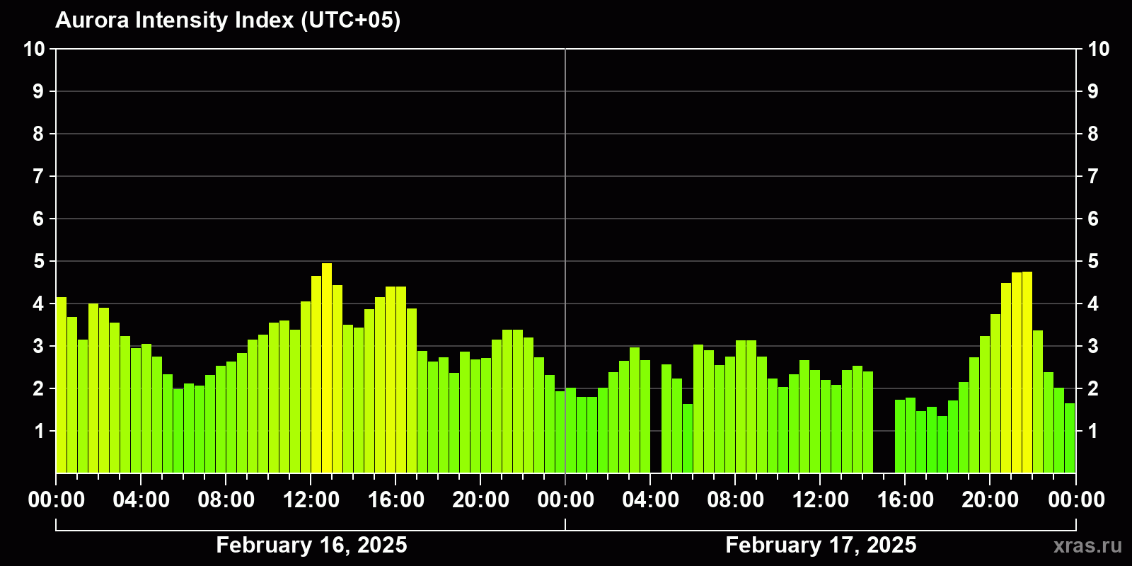 Auroral intensity index and the theoretically possible latitude of observations for nighttime in the Estern Hemisphere as of 2025-02-17 23:53 (end of day) local time