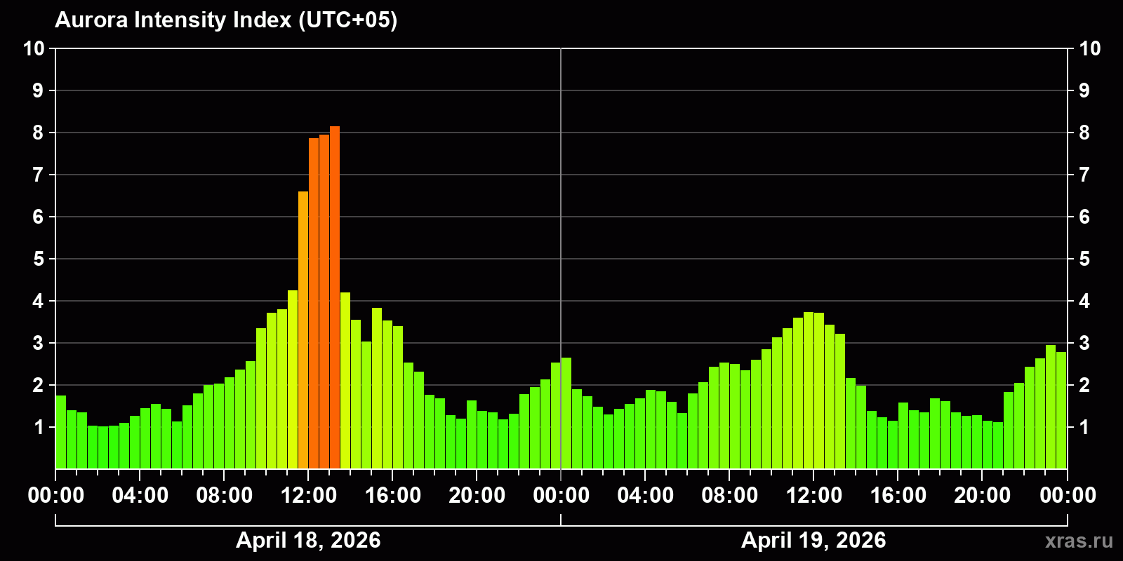 Changes in the auroral intensity index from 2026-04-18 to 2026-04-19 local time
