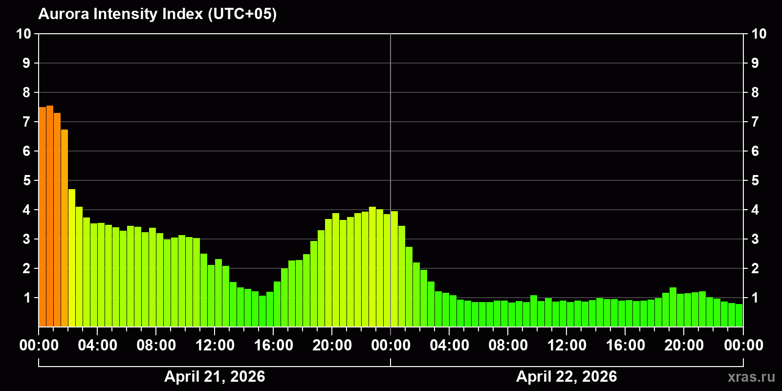 Changes in the auroral intensity index from 2026-04-21 to 2026-04-22 local time