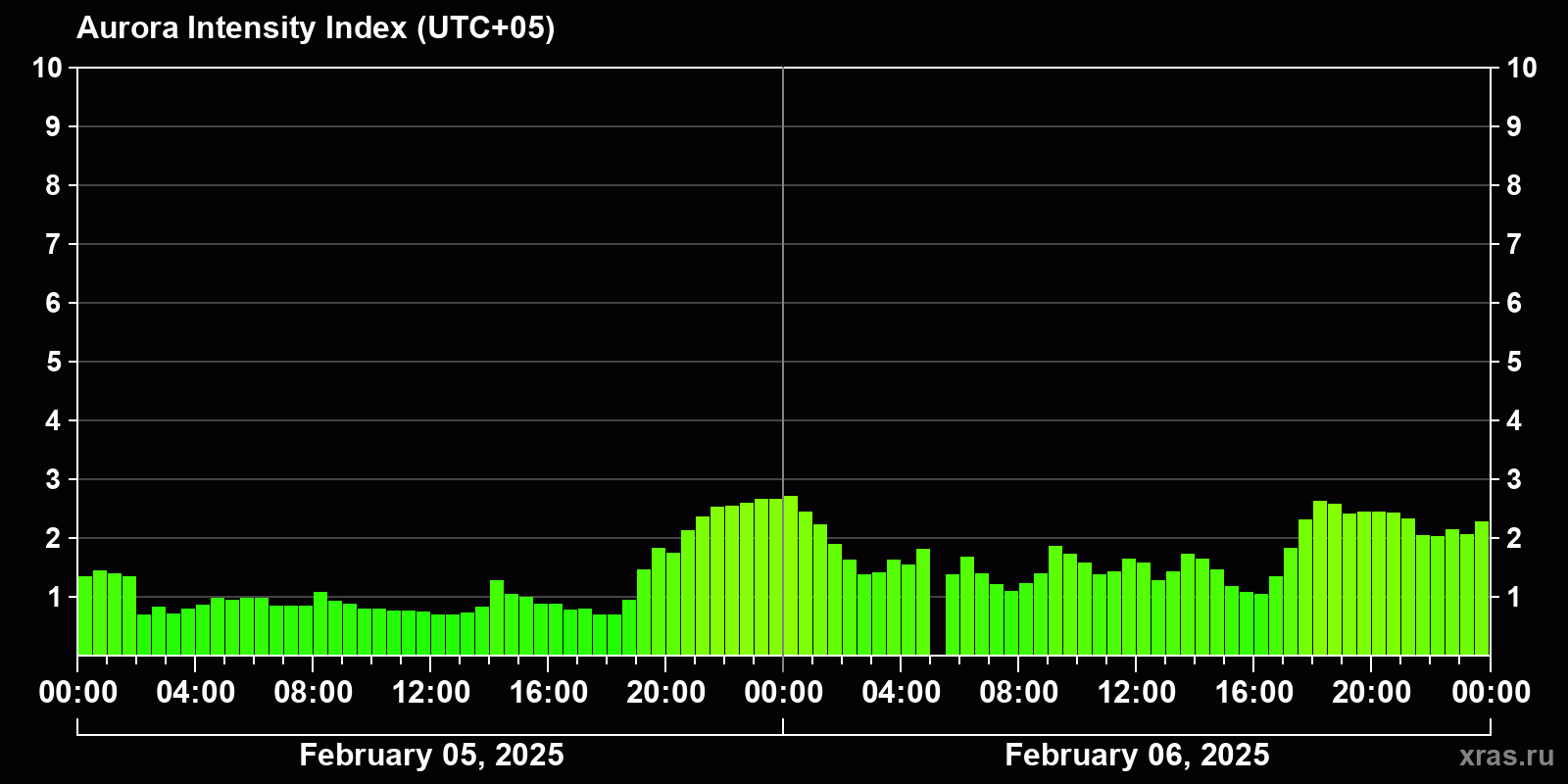 Changes in the auroral intensity index from 2025-02-05 to 2025-02-06 local time