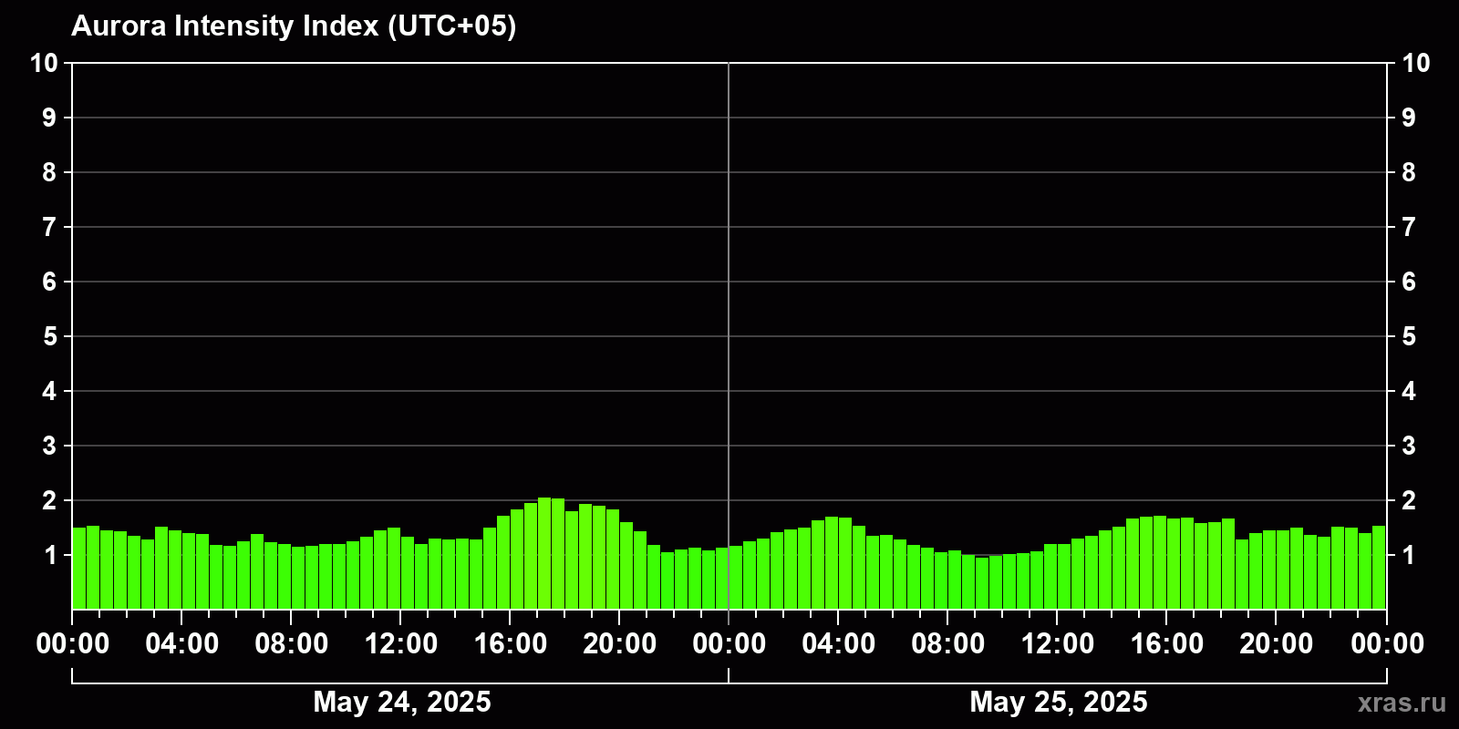 Changes in the auroral intensity index from 2025-05-24 to 2025-05-25 local time