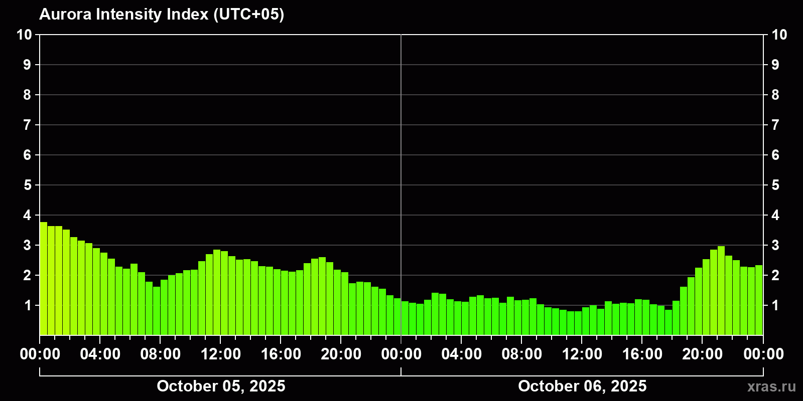 Changes in the auroral intensity index from 2025-10-05 to 2025-10-06 local time