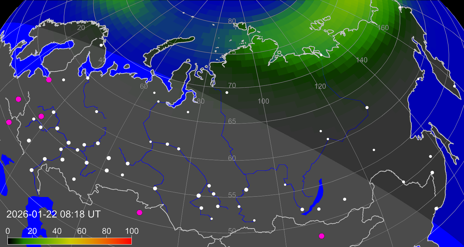 Вероятность полярных сияний в городах Российской Федерации