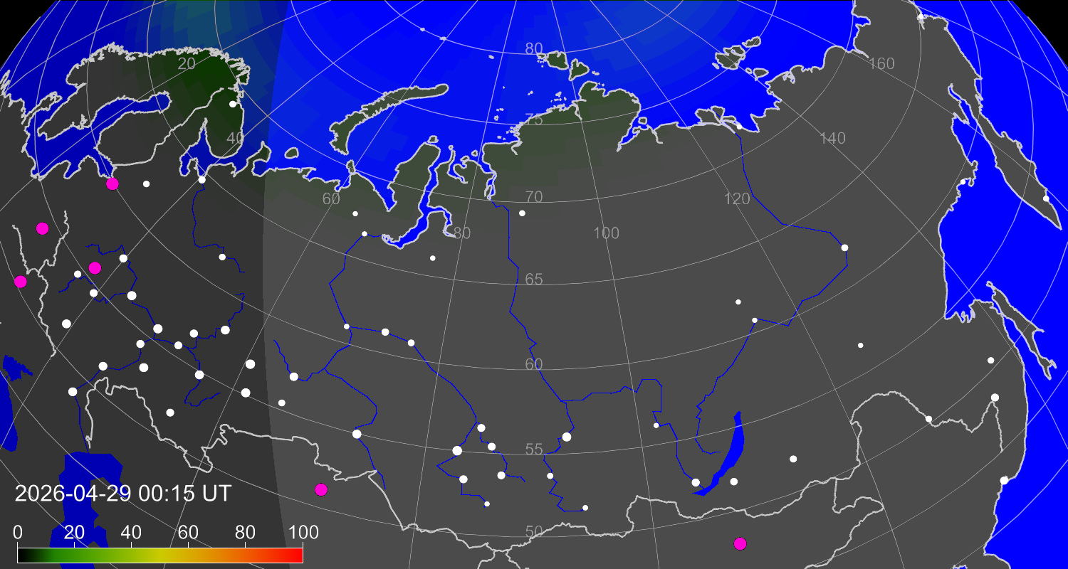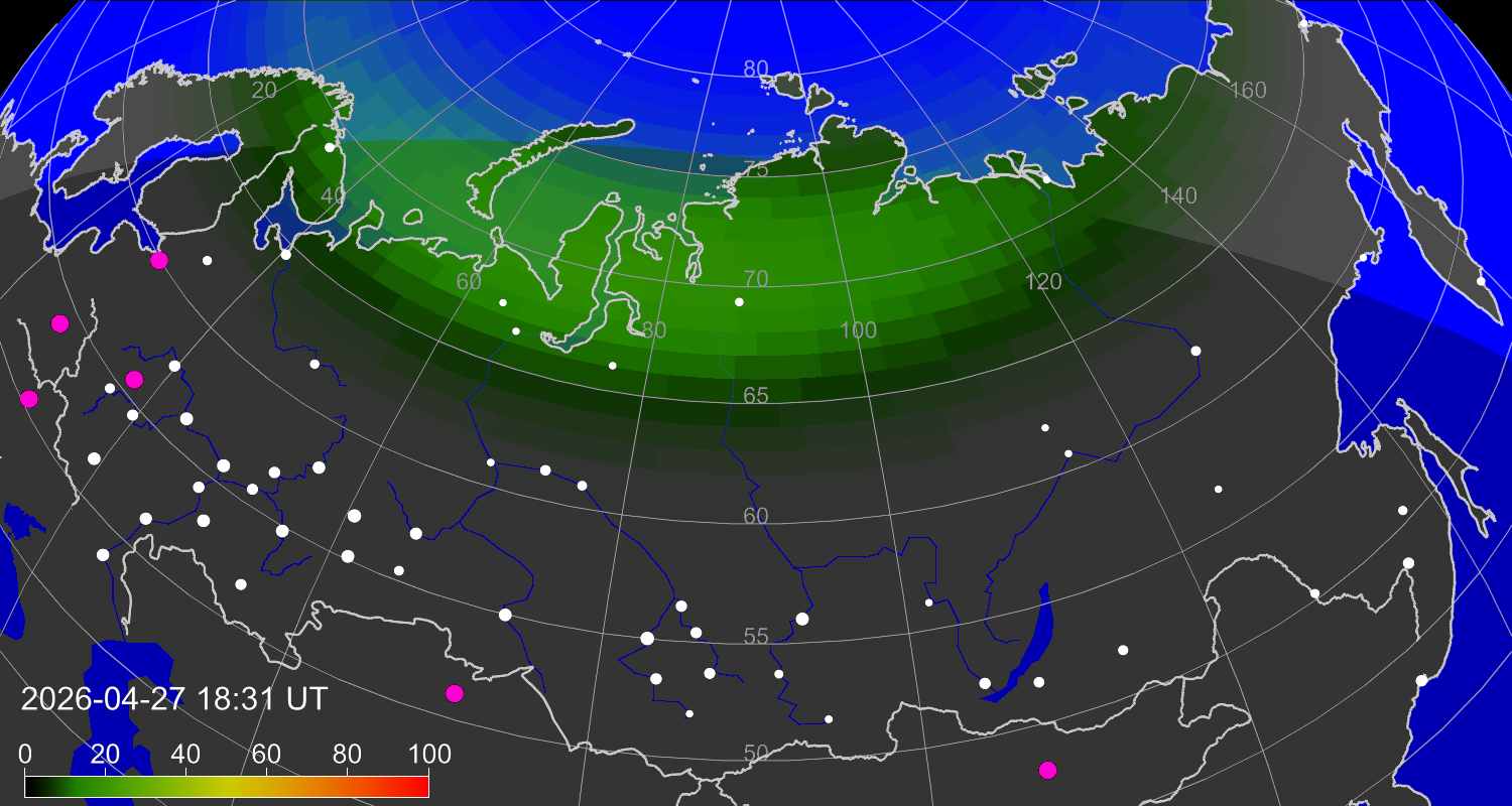 Probability of northern lights (auroras) in cities of Russia