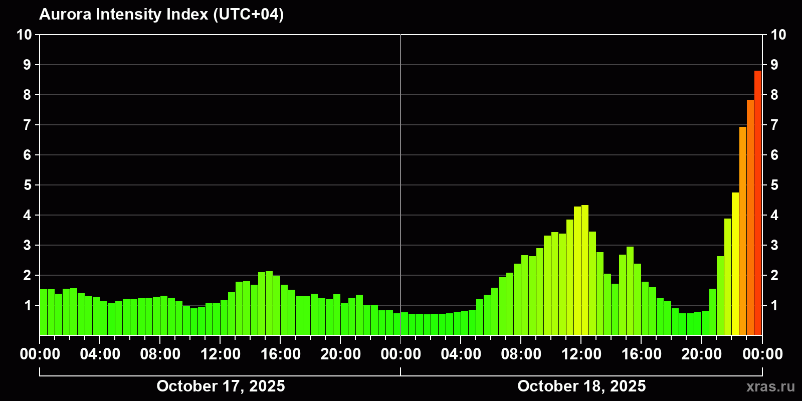 Auroral intensity index and the theoretically possible latitude of observations for nighttime in the Estern Hemisphere as of 2025-10-18 23:52 (end of day) local time