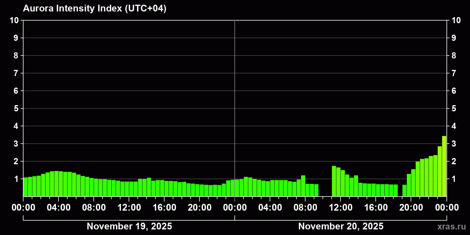 Auroral intensity index and the theoretically possible latitude of observations for nighttime in the Estern Hemisphere as of 2025-11-20 23:54 (end of day) local time