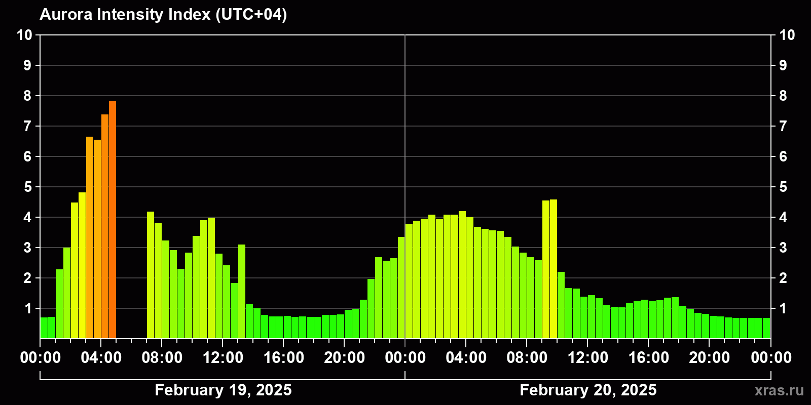 Auroral intensity index and the theoretically possible latitude of observations for nighttime in the Estern Hemisphere as of 2025-02-20 23:42 (end of day) local time