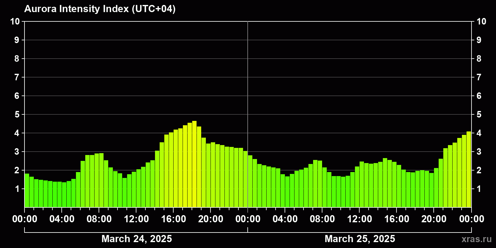 Auroral intensity index and the theoretically possible latitude of observations for nighttime in the Estern Hemisphere as of 2025-03-25 23:52 (end of day) local time