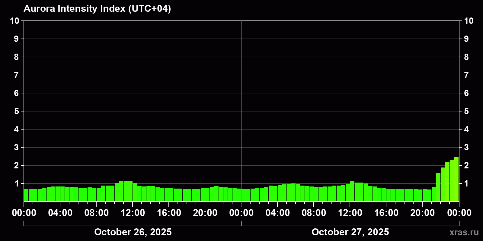 Auroral intensity index and the theoretically possible latitude of observations for nighttime in the Estern Hemisphere as of 2025-10-27 23:48 (end of day) local time