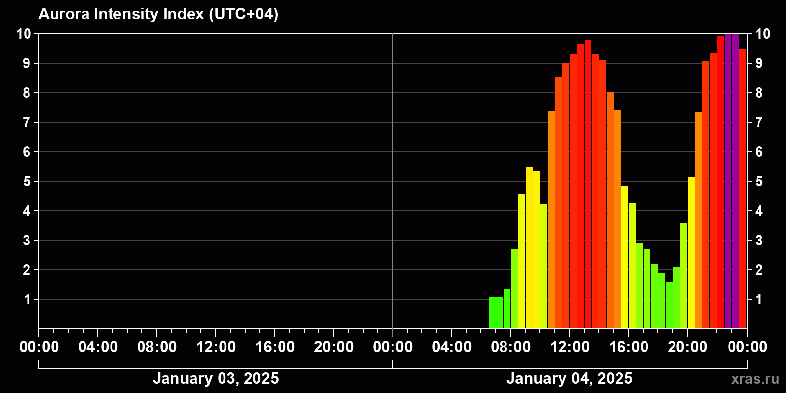 Auroral intensity index and the theoretically possible latitude of observations for nighttime in the Estern Hemisphere as of 2025-01-04 23:51 (end of day) local time